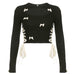 This ribbed black top features a daring front cut-out and is embellished with сгеу ivory bows. perfect for a coquette aesthetic outfit