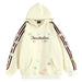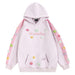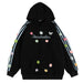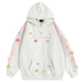 This cute blokette aesthetic hoodie features an oversized fit. colorful knitted flowers. and side stripe details on the sleeve. Includes a front kangaroo pocket and a drawstring hood.