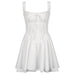 A dreamy white mini dress with corset-style seams. lace trim on the straps and hem. and a flared skirt for a romantic vibe