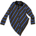 Oversized rugby polo with bold diagonal stripes in brown. black. blue. and red. finished with a black collar and button placket. Long sleeves and a loose fit give it a chill. skater-inspired aesthetic