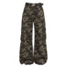 These camo cargo pants feature wide legs. multiple pockets. and a loose fit