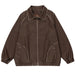 This aesthetic collar bomber jacket featuring vegan leather construction in coffee brown. Designed with a full zip closure. relaxed drop-shoulder cut. and ribbed hem. Includes welt side pockets and a pointed collar for a retro 90s feel