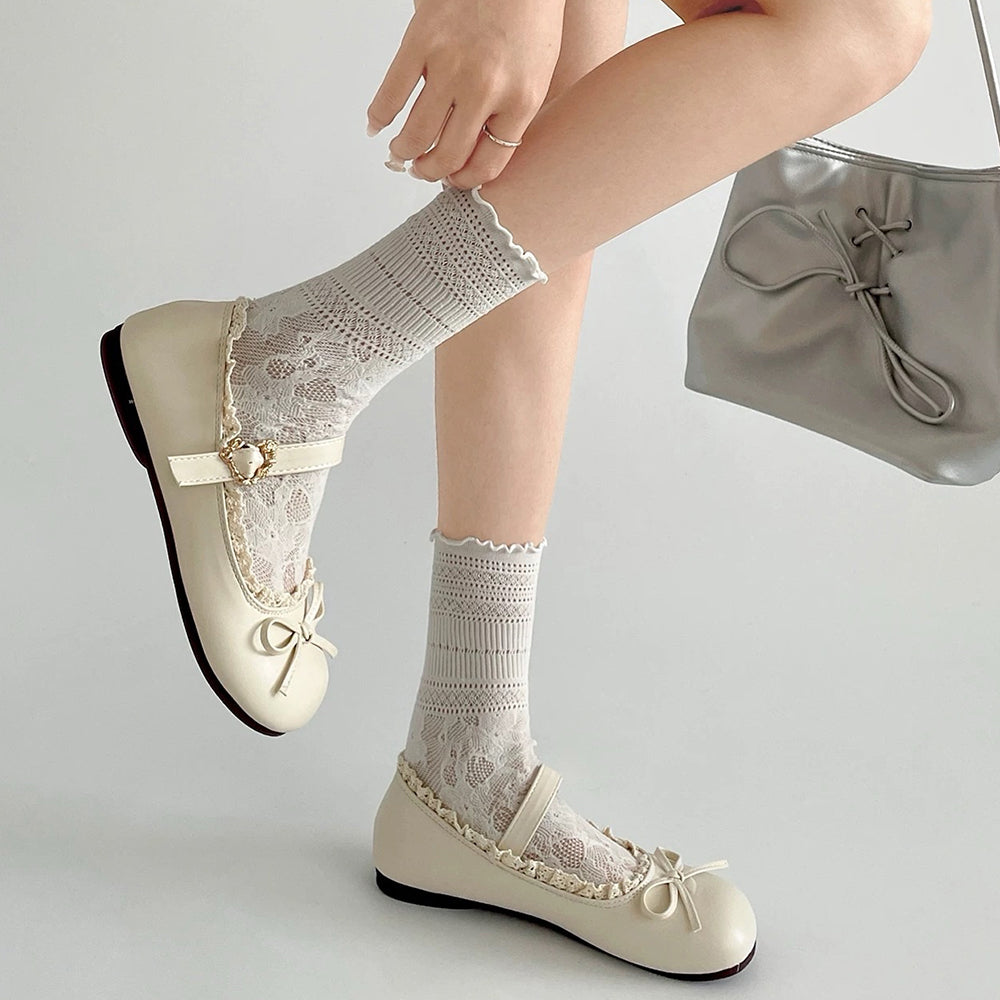 These aesthetic Mary Jane shoes feature delicate lace trim. a dainty bow detail. and an adjustable strap with a vintage-inspired buckle