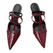 These aesthetic T-strap heels feature a sculpted pointed toe. slim stiletto heel. and glossy patent finish