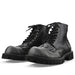 These combat boots have a leather construction with embossed flame designs on the sides. They feature a thick. treaded sole and include a lace-up closure