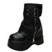 Aesthetic boots with a high shaft. large platform. and dual buckle straps. accented with a side zipper