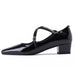 These black Mary Jane heels feature a glossy patent finish. square toe. and delicate cross-strap design