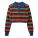 This aesthetic Primary Colors sweater features a vibrant striped pattern with a cropped fit and a soft collared design. The half-zip front adds versatility and a retro vibe