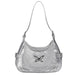 This silver handbag has a glossy design with a butterfly detail and a single shoulder strap