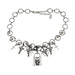 This aesthetic necklace featuring a chunky silver chain with skull and cross charms. The central padlock pendant adds a heavy grunge accent. blending gothic and punk elements into a bold statement piece