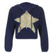 This Navy Blue Star Hoodie features a knitted construction. a bold star print. a cropped fit. and a front zip-up closure