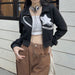This long sleeve top has a high neckline. a star print on the front. and a front zipper closure