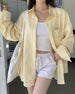 This shirt features pastel yellow stripes. wide sleeves. and chill vibes. Looks like sunshine. feels like weekend