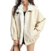 This aesthetic faux fur jacket featuring a plush collar. structured fit. and warm cream finish. The suede-like surface contrasts with the fluffy white lining. giving it a creamy layered texture that feels equal parts soft and bold