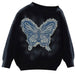 This butterfly sweater featuring a loose knit structure. soft beige tone with washed effect. and a large embroidered butterfly in denim blue. The wide neckline and drop shoulders add a cozy silhouette