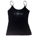 Slim black cami with rhinestone "bebe" lettering across the chest. Y2K vibes with a lightweight. stretchy fit