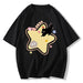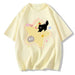 Casual oversized yellow t-shirt featuring a playful cartoon black cat and star print